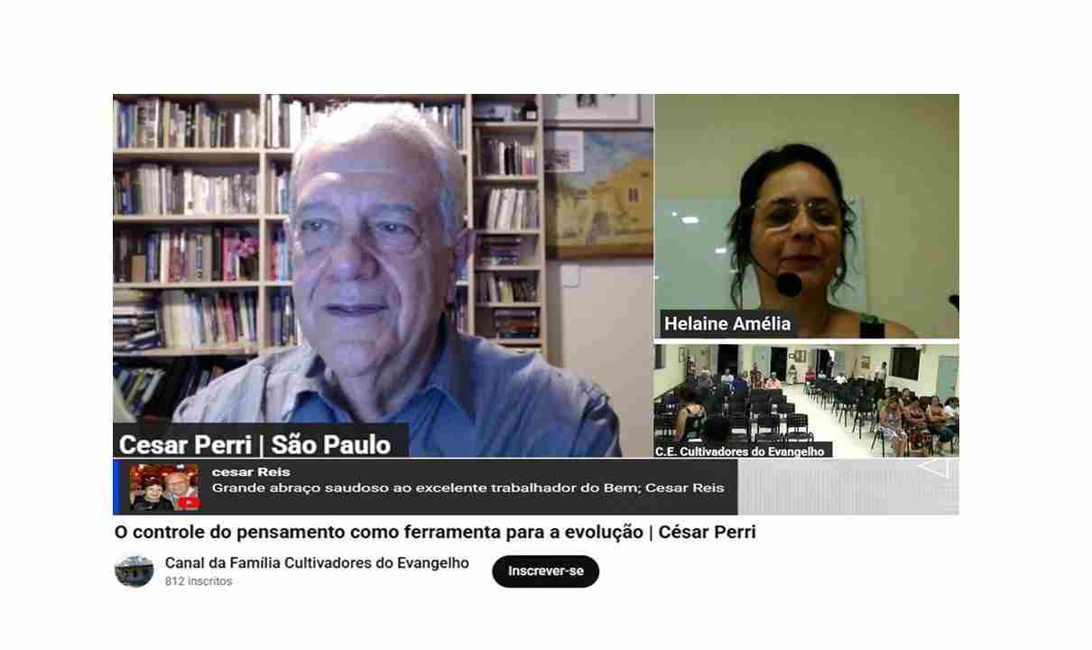 Palestra virtual com Cesar Perri (de São Paulo), sobre o tema: O controle do pensamento como ferramenta para a evolução. Transmissão em tela para as dependências do Centro Espírita Cultivadores do Evangelho, de Magé (RJ) e pelos Canais da Família Cultivadores do Evangelho no Youtube, Facebook e Twitter. Direção da reunião por Helaine Amélia e participação de internautas como de Cesar Reis.