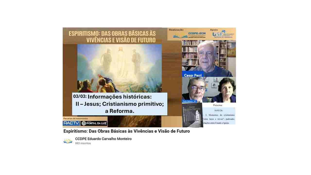 O tema: “Informações históricas: II – Jesus; Cristianismo primitivo; Reforma” foi desenvolvido no dia 03 de março, por Cesar Perri (São Paulo), no estudo virtual “ESPIRITISMO: DAS OBRAS BÁSICAS ÀS VIVÊNCIAS E VISÃO DE FUTURO”, coordenado pelo expositor e promovido pelo Centro de Cultura, Documentação e Pesquisa do Espiritismo Eduardo Carvalho Monteiro, de São Paulo. A reunião foi coordenada por Pedro Nakano, com apoio técnico de Kátia Golinelli e de Sidnei Zaluchi (da USE-SP). As transmissões às 20 horas das 3as feiras, pelo CCDPE, canal do You Tube, e conta com parcerias da Estação Dama da Caridade Benedita Fernandes/RAETV e da WebRadio Portal da Luz.