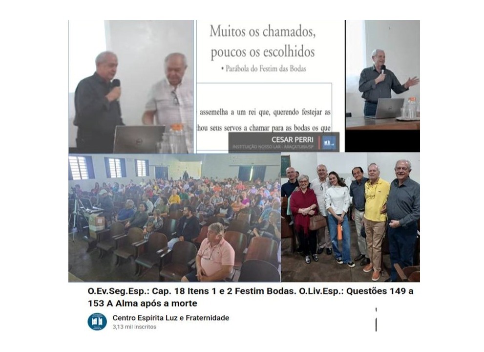 Na reunião pública do dia 19/10/2025, na Instituição Nosso Lar, Araçatuba (SP), o tema "parábola do festim de bodas" de "O Evangelho Segundo o Espiritismo" (Capítulo 18) foi desenvolvido por Cesar Perri, de São Paulo em visita à Instituição, e o tema "a alma após a morte" ("O Livro dos Espíritos", q. 149-153) foi abordado por Paulo Cacciatori. A reunião foi dirigida por Paulo Sérgio Perri de Carvalho. Presentes Célia Carvalho, Ismael Gobbo e esposa, e colaboradores da Estação Dama da Caridade. A reunião pública é transmitida pela Instituição e pela Estação Dama da Caridade Benedita Fernandes.