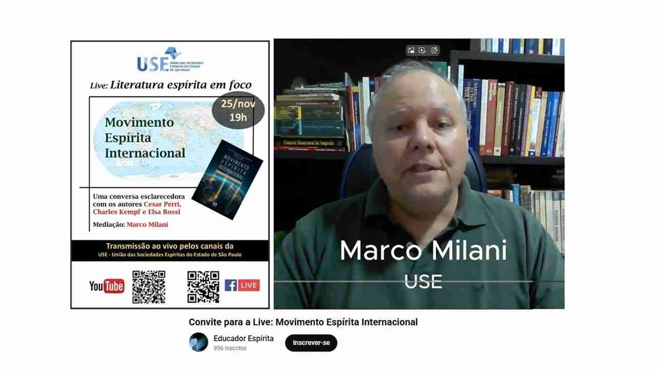 Marco Milani, diretor da USE-SP, entrevistará os autores do livro Movimento espírita internacional. Origens, ideais e experiências, editado pelo CCDPE-SP. No dia 25 de novembro às 20 horas, haverá o diálogo ao vivo com os autores Cesar Perri (São Paulo), Charles Kempf (FSF, França) e Elsa Rossi (BUSS, Inglaterrra).