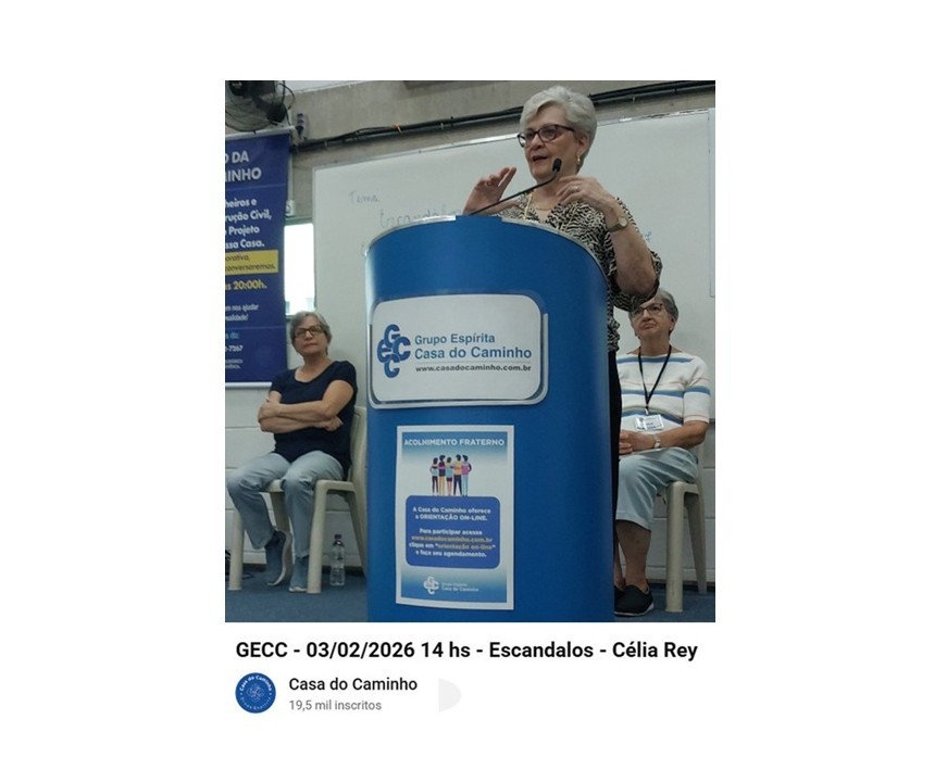 Na reunião vespertina do dia 03 de fevereiro no Grupo Espírita Casa do Caminho, em São Paulo, Célia Maria Rey de Carvalho proferiu palestra sobre o tema “escândalos”, com base em frase de Jesus “Ai do mundo por causa dos escândalos” analisada em “O Evangelho segundo o Espiritismo” (Cap. VIII). A reunião foi dirigida por Inês Bareia. Preliminarmente houve apresentação de violão e canto com Helson Lever Camilli.
