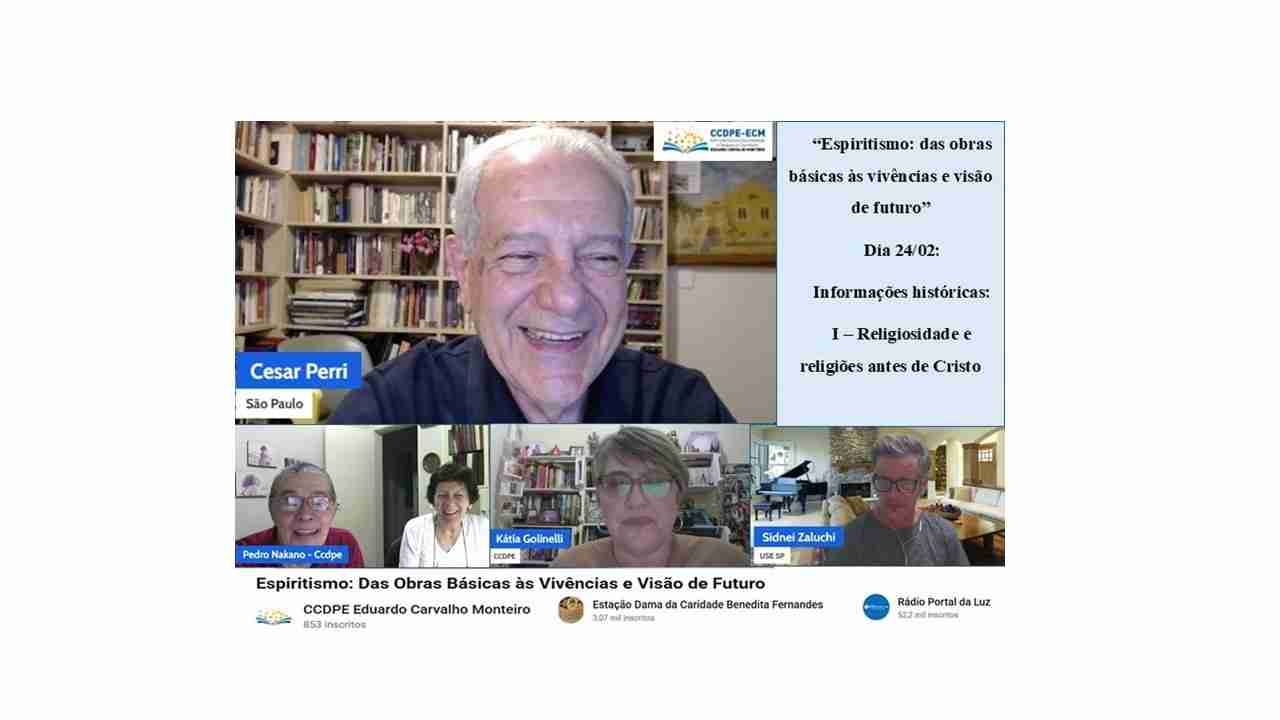 O tema: “Informações históricas: I – Religiosidade e religiões antes de Cristo” foi desenvolvido no dia 24 de fevereiro, por Cesar Perri (São Paulo). Trata-se do início do estudo virtual “ESPIRITISMO: DAS OBRAS BÁSICAS ÀS VIVÊNCIAS E VISÃO DE FUTURO”, coordenado pelo expositor e promovido pelo Centro de Cultura, Documentação e Pesquisa do Espiritismo Eduardo Carvalho Monteiro, de São Paulo.